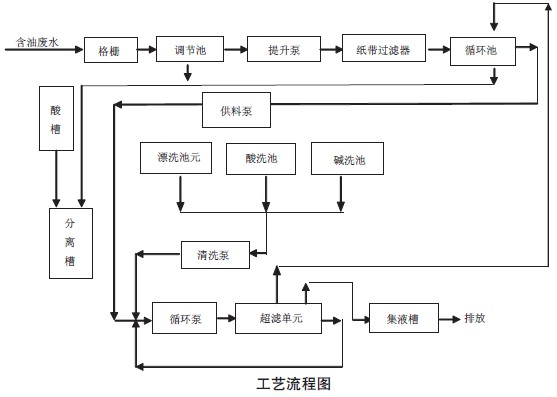 供料泵將循環池含油廢水送至循環泵入口,與大回流液混合進入超濾膜,一部分通過膜,成為凈化的滲濾液,大部分進行大回流,還有一部分回流至循環池。通過供料泵連續給料,循環泵工作,并經調節形成一個超濾管正常工作所必須的壓力網。