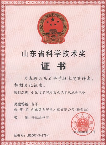 小區污水回用集成技術及成套設備由生物反應器和膜分離單元組成。具有技術先進、全程自動化管理、創先使用管狀膜、便于工廠化生產管理等特點。專家認定:該技術及設備總體達到國內領先水平,具有很好的示范和推廣應用價值。本技術先后被評為“國家火炬計劃項目”、“山東省科技進步三等獎”,應用工程被評為“中國環境保護實用技術示范工程”。