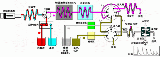 儀器的陶瓷恒流泵間隔吸入過硫酸鉀氧化消解液和水樣在貯液管中,再將其推入加熱的反應毛細管中擴散,形成消解液和水樣混合,在高溫高壓下,水樣中的各種含氮化合物經過過硫酸鉀氧化消解轉變成硝酸鹽。用磷酸(pH=1.8)溶液作載流液,消解后的水樣被注入閥定量切入載流液中,通過鎘柱將硝酸鹽還原為亞硝酸鹽,進入顯色反應管,在酸性條件下,亞硝酸鹽與對氨基苯磺酰胺起重氮化反應,再與鹽酸萘乙二胺耦合,生成玫瑰紅色氮染料,流經比色計的流通池內,測量其光電壓變化值,通過其峰高或峰寬,可求得樣品中的TN含量。儀器每天自動做一次標定。