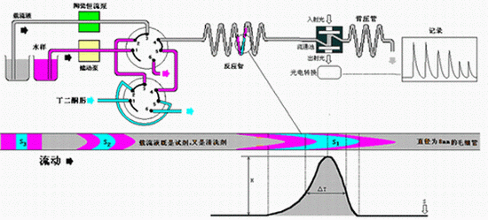 載流液經陶瓷泵輸送至反應管道中,當六通閥將水樣和顯色劑切入反應管道中后,樣品和試劑被載流液推進并在推進過程中漸漸擴散,呈現梯度混合,梯度混合區帶快速發生顯色反應,流過流通池,由光電比色計測量并記錄液流中反應的酒紅色絡合物對530nm波長光吸收后透過光強度的變化值,獲得有相應峰高和峰寬的響應曲線,用峰高或峰寬,經比較計算求得水樣中鎳離子的值。儀器每天自動做一次標定。