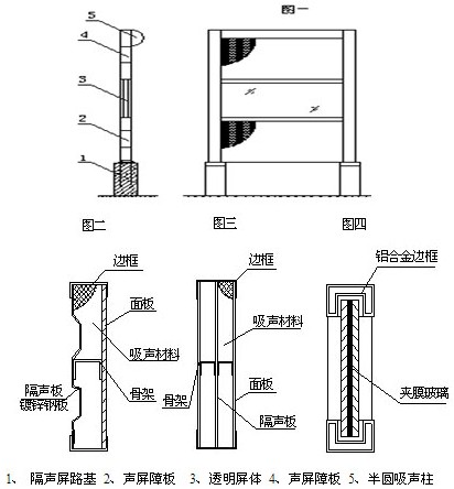 聲屏障由聲屏障板、透明屏體和支撐構建組成(見圖一);單面聲屏障板結構見圖二;雙面吸聲聲屏障見圖三;透明屏體結構見圖四。支撐構件可用H鋼制作,也可用鋼筋混凝土結構。支撐構件同基礎的連接可用地腳螺栓連接,也可預制預埋。