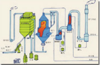 來自于酸洗線的廢酸用泵送到過濾器中,過濾去掉固體顆粒和不溶物,在預濃縮器與熱焙燒氣體熱交換使部分液體蒸發形成濃縮廢酸。將濃縮廢酸用泵送到焙燒爐,在高溫狀態下,使FeCl2分解為Fe2O3和HCl。Fe203粉落入爐下錐體,由收集輸送系統收集。含有HCL的熱焙燒氣體從爐頂部離開焙燒爐,通過旋風除塵器除去Fe203粉后進入預濃縮器,與循環廢酸接觸而被冷卻清洗,再進入吸收塔,HCl被吸收形成再生酸。
