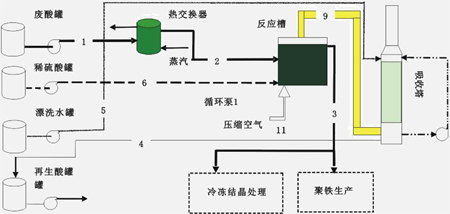 該技術采用加入硫酸置換反應原理,從帶鋼酸洗廢液中回收鹽酸和高品質硫酸鐵或硫酸亞鐵。工藝過程包括:熱交換、置換反應、氯化氫洗滌吸收等。