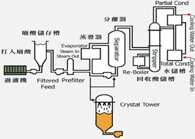 來自酸洗線的廢酸儲存于廢酸儲罐,經泵提升經廢酸過濾器泵入回收系統的熱交換區間。廢酸經過蒸汽換熱器進行熱交換后進入蒸發分離器,廢酸和水在此不斷的蒸發,直到溫度達到飽和點為止。通過調整廢酸進入系統的速度和過飽和酸及水蒸汽離開蒸發回路的速度,系統即可循環運轉。