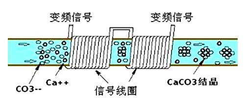 【 阻垢 】:Decent_tech非接觸電子感應水處理系統由一臺Decent_tech非接觸電子感應水處理儀和信號線圈組成。水處理儀可以產生一種復雜的頻率調制信號,通過纏繞在管道上的信號線圈,產生的不同頻率的電磁脈沖與水分子及溶于水中的鈣、鎂離子和碳酸根離子發生諧振,從而改變鈣、鎂離子、碳酸根離子和水分子的電特性與物理特性,促使水中的部分鈣、鎂離子和碳酸根離子迅速析出,結晶成特定結構的微小晶體。由于這一過程是在瞬間完成,所析出的晶體來不及附著在管壁上而很快就會被排走;而處理后的水在溫度、壓力改變時,水中未結晶的鈣、鎂碳酸鹽會優先在這些微小晶體周圍結晶,使水垢以松軟絮狀析出,懸浮在水中,不再吸附在管道上,很容易被水流沖走,從而達到“阻垢”的目的。阻垢原理示意圖如下: