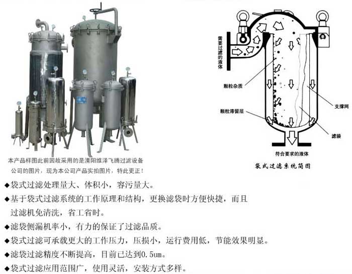袋式過濾機是一種結構新穎、體積小、操作簡便靈活,節能、高效、密封工作,適應性強的多用途過濾設備,它廣泛適用于化工、涂料、油墨、食品等行業。 特點:該種過濾機是一種壓力式過濾裝置,待濾液在泵作用下,濾液通過所需要細度等級的濾袋能獲得合格的濾液。該機更換濾袋十分方便,過濾基本無物料消耗。該機有設計成單過濾機,雙聯過濾機,并可配套輸送泵組裝在移動式推車上。過濾機濾袋保護網均為不銹鋼制作,其余部件有分碳鋼和不銹鋼制作兩種,供過濾不同介質的用戶選擇。