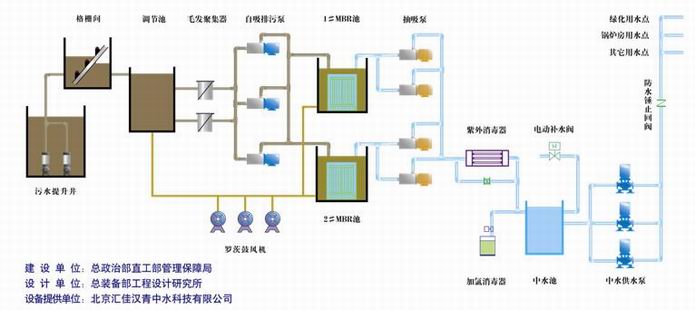 黃寺中水站位于解放軍總政治部黃寺大院東院,隸屬于總政治部直工部管理保障局,建筑面積共356平方米,其中地上一層31平方米,地下一層108平方米,地下二層217平方米。采用目前國際上先進的膜-生物反應器(Membrane Bioreactor,MBR)中水處理工藝,處理規模為500m3/d。