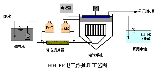 在直流電解作用下,氧離子在陽極失去電子生成氧氣,氫離子在陰極獲得電子生成氫氣,這種初生態的氫、氧氣比重輕、粒徑均勻、附著力強等特點,當其與被處理廢水中的懸浮物或油滴接觸時,使絮凝物的視比重比水輕,使水中污染物質結構發生氧化還原反應,達到去除脫色的目的。并在上浮力的作用下,使絮凝物上浮至凈化水表面形成穩定的浮渣層,通過機械或人工刮去浮渣,使污水得到凈化。