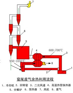 由回轉窯出來的窯尾廢氣約為950~1050℃,進入高溫熱管換熱器的蒸發段,將熱量傳遞給高溫熱管,降溫后的廢氣溫度仍在600℃以上。如果燃料含硫量不高則可再次進入預熱器系統作為預熱生料的熱源,如原料含硫量高則可作為其他熱源使用。由冷卻機出來的二次風溫度約為600~700℃(溫度的高低與冷卻機的結構形式有關),進入高溫熱管換熱器的冷凝段。由高溫熱管傳來的熱量將二次風的溫度進一步提高到750~850℃,進入分解爐。這樣既利用了高溫廢氣高品位余熱,又不致于降低二次風中的含氧量。由于入爐的二次風溫度提高,含氧量高,因而入分解爐的燃料可以充分燃燒,大大節省燃料,達到節能的效果。