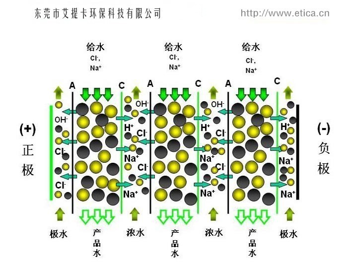 帶負電荷的陰離子(例如OH-、Cl-)被正極(+)吸引而通過陰離子交換膜,進入到鄰近的濃水室。此后這些離子在繼續向正極遷移中遇到鄰近的陽離子交換膜,而陽離子交換膜不允許陰離子通過,這些離子即被阻隔在濃水中。淡水流中的陽離子(例如Na+ 、H+)以類似的方式被阻隔在濃水室。在濃水室,透過陰陽膜的離子維持電中性。