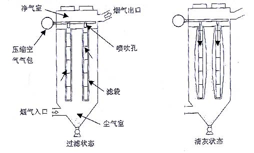袋式除塵器采用特制的濾袋來過濾煙氣。煙氣在通過內部有籠骨的濾袋時,粉塵由于與濾纖維發生碰撞、攔截、吸附等作用被捕集在濾布表面并形成所謂的粉餅層,氣體則穿過濾袋,進入除塵器上部的凈氣室,匯集到出風管排出。隨著除塵器的運行,濾袋表面的粉餅厚度不斷增加,氣體通過濾料的阻力隨之增加,為了保證設備的連續運行,必須采用一些方法將堆積在濾袋上的粉塵清除,這個過程稱之為清灰。