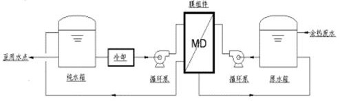 采用楓科最新研發的疏水性PVDF微孔膜,以膜兩側的蒸汽壓力差為驅動力的膜分離過程。水的飽和蒸汽壓隨溫度的指數關系增加。將不同溫度的水引入膜的兩側,由于膜的疏水性,兩側的溶液相均不能透過膜。但由于高溫側水溶液與膜界面的水蒸汽壓高于低溫側,水蒸汽會從高溫側透過膜孔進入低溫側并冷凝成為滲出水,留在高溫側的溶液則得到濃縮,成為滲余液。
