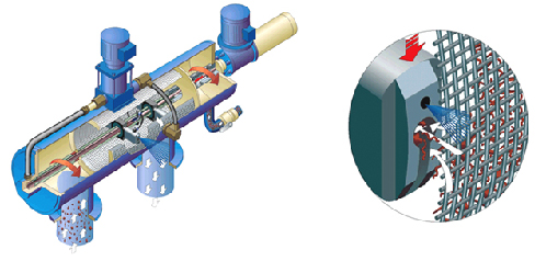 在清洗狀態下,過濾器的排放室始終打開,直接與大氣相通,并通過持續排污閥和超級排污閥不斷排出小流量的水,這股水流都是經由各吸嘴出來的,這些吸嘴直接與一個中空的吸吮掃描器相通,并經由渦輪室再到排污閥排出。