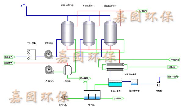 該工藝分為三個過程:廢氣吸附、蒸汽脫附、熱風烘干。經過預處理后的有機廢氣進入吸附凈化床中,吸附床中的活性炭將廢氣中的有機成分吸附在內部微孔結構中,凈化后的潔凈氣體通過煙囪達標排放。每套裝置設置二至四臺吸附床,正常運行中一臺吸附床處于脫附再生階段或備用階段,其他吸附床處于吸附階段,通過不同吸附床的切換使用使凈化系統連續運行,不影響車間正常生產。