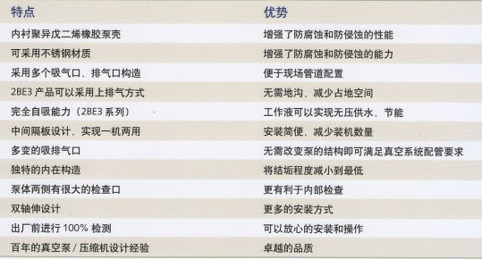 NAStl2BE3/P2620系列采用聚異戊二烯橡膠內襯泵殼作為標準設計,進一步增強了其耐腐蝕和防侵蝕性能。為了提高現場安裝及使用的靈活性,NASI_{2BE3系列在制造時就同時預留了頂面和側面的吸、排氣法蘭,且具有相同的口徑。這樣一方面很容易采用2BE3/P2620產品來更換已有的老式真空泵;另一方面在設計新廠房布局時,選用2BE3/P2620也顯得更加靈活。每一臺2BE3/P2620 產品在出廠前都經過嚴格的測試,以保證其滿足各項性能指標以及適于長期運行的嚴格質量要求。
