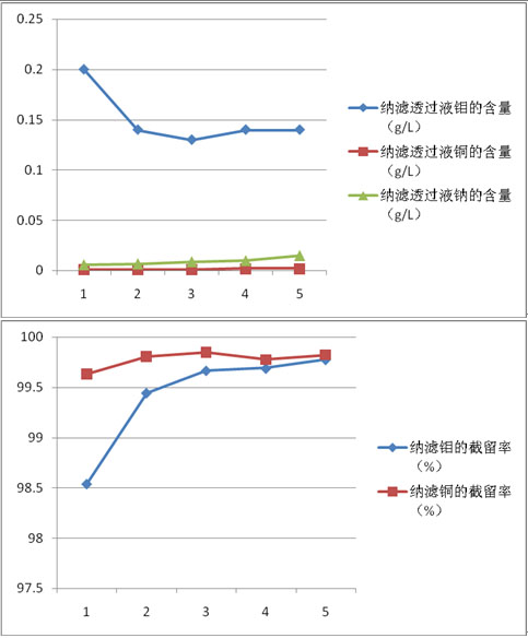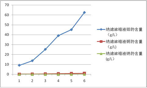 鉬的濃縮中,納濾的截留率穩定在98%以上,重金屬離子如Cu的截留率也在98%以上,而納濾濃縮液鈉離子的積累量穩定在回用料液安全指標之下。