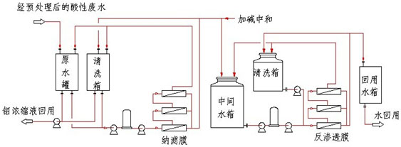 我公司在陜西金堆城鉬業鉬酸銨生產改造項目中應用的利用膜技術在鉬酸銨廢水的處理工藝如下: