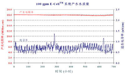 圖12為某實際運行的E-Cell系統產水電阻率,當進水水質發生波動的時候,產水水質能很好的穩定在18Mohm•cm左右。
