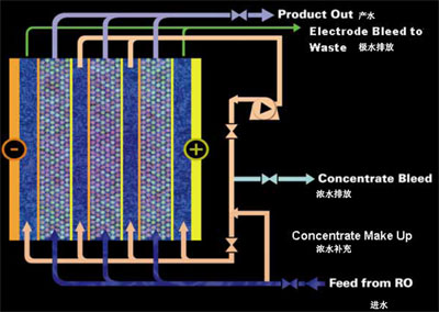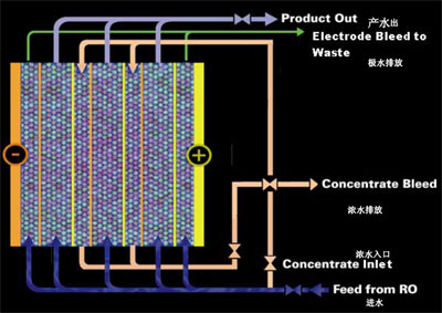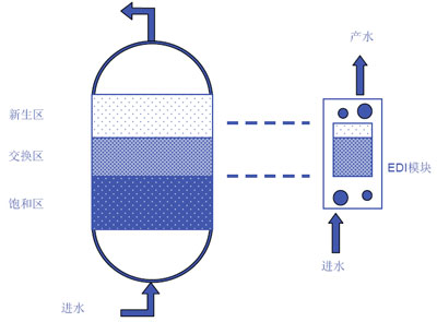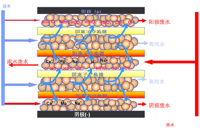 3,水分子在電的作用下被不斷的離解為H+和OH-,H+和OH-將分別使得被消耗的陽/陰樹脂連續的再生。