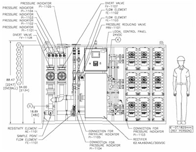 相對與混床及其附屬設備而言,EDI系統的占地空間更小,下圖為的單套17~120t/hr產水量的E-Cell系統占地空間,而對于更大的系統,僅需將系統做相應的延伸或者增加套數即可。