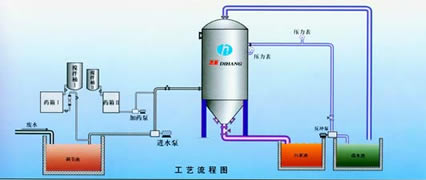 廢水進入調節池,經進水泵抽至凈化器,同時利用負壓原理,將藥劑與廢水一并吸入管道中初步混合,進入凈化器。在凈化器內經混凝反應、離心分離、重力分離、動態過濾及污泥濃縮等過程從凈化器頂端排出凈化后的凈水,濃縮后的污泥從底部定時或連續排出。經過一段時間運行,開啟反沖洗泵進行反沖洗。該產品取代了傳統的攪拌混凝反應、沉淀、刮泥、提升、過濾、反沖、污泥濃縮等繁瑣的工藝流程及構筑物體系。