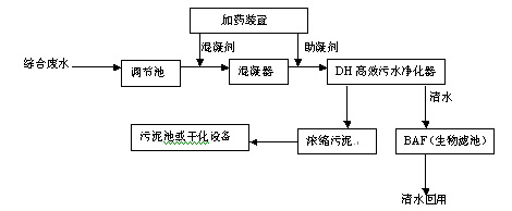 電廠各種廢水收集進入綜合調節池進行水質水量的調節。調節池污水經泵提升,在泵后管道上設置混凝混合器,在混凝混合器前后分別投加絮凝劑、助凝劑,然后進入凈化器中,經離心分離、重力分離、動態把關過濾及污泥濃縮等過程從凈化器頂部排出經處理后的清水送入清水池。污泥排入污泥池。