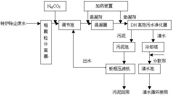 對轉爐除塵廢水處理的沉淀效率、水質穩定、污泥回收等幾個方面的考慮,以實現穩定的水閉路循環為目的,典型工藝流程如下:如果高爐煤氣洗滌水和轉爐除塵廢水混合后處理,可以達到水質穩定,工藝流程將簡化。
