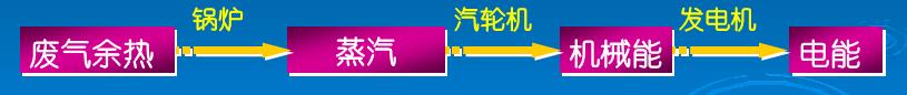 通過余熱回收裝置——余熱鍋爐將工業生產中排出的廢氣余熱進行回收換熱,產生過熱蒸汽或飽和蒸汽推動汽輪機實線熱能——機械能的轉換,再帶動發電機發出電能,并供給工業或生活中的用電負荷。