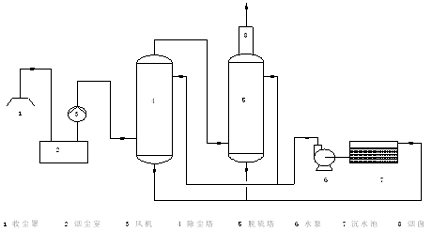 本設備技術除塵部分的原理采用四級除塵:一級除塵,煙氣在引風機的作用下由進入有特制吸風口的收塵罩,通過煙道進入煙氣緩沖室,利用顆粒自身的重力沉降除塵,結合緩沖室合理的結構設計,除去一部分較大顆粒的粉塵。二級除塵是利用在除塵塔中多層噴嘴形成由上而下的水膜與切向流動的含塵煙氣進行充分碰撞、攔截和凝集等作用,來對含塵煙氣洗滌而進行除塵;三級除塵是通過脫硫塔,與特殊的填充層逆向接觸,使其中的水分及沒有被除掉的細小灰塵顆粒,形成細小含灰水滴,高比表面積的填充物上的水膜和含塵煙氣反復碰撞作用進行除塵;再由捕滴器脫除煙氣中剩余的含塵水滴,形成四級除塵。
