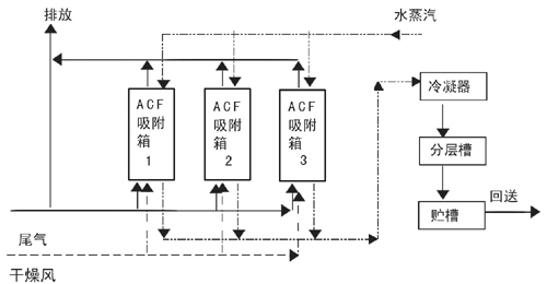 ACF有機廢氣吸附回收裝置由預處理系統、吸附系統、解吸系統、管路系統、冷凝回收系統等部分組成。整個工藝流程如圖所示,三個吸附箱分別進行吸附、解吸、干燥工序。當有機廢氣進入吸附箱后,其中的有機物穿過活性炭纖維后被吸附下來,凈化后的氣體由吸附箱頂部排出。A、B、C三個吸附箱交替切換。采用低壓水蒸汽為脫附劑進行解吸,由吸附箱頂部進入,穿過活性炭纖維床,將被吸附濃縮的有機物脫附出來并帶入冷凝器,經過冷凝,有機物和水蒸汽的混合物被冷凝下來流入分層槽。如果吸附的有機物不溶于水,則混合物進入分層槽通過重力沉降分離,達到回收有機物的目的,分離后的污水排放至廠方化學污水系統集中處理后排放;如需處理的有機物溶于水或水中溶解度較大則必須進行后處理(如精餾等)。系統運行過程中所有的動作切換,均由控制系統自動完成。(注:根據工藝要求,可設計為雙箱或多箱系統)