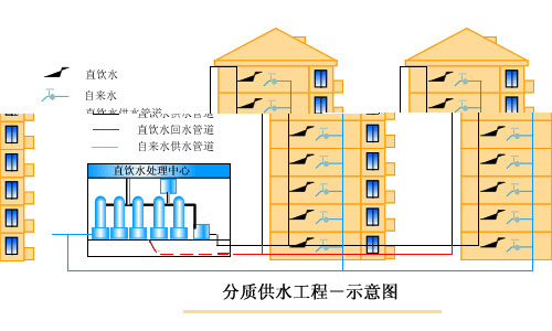 社區分質供水也稱管道直飲水,是把飲用水和生活用水區分開,以不同的管網系統供應用戶。在居民小區里建立中央凈水機組,采用先進的反滲透(RO)技術,將市政管網提供的自來水進行二次深度處理,去除水中的有毒有害物質,生產出純凈水,從制水機房至每個用戶之間通過飲用水專用PP-R管道連接起來,經管網恒壓供水系統,由總管一立管一支管進入每戶家庭,計量水表為IC智能手表。管道直飲水的供應采用全封閉式管內生產技術和全網活水循環形式,確保水質優于世界衛生組織(WHO)和國家飲用水標準,而且水質“鮮”、“活”、“凈”、“純”。