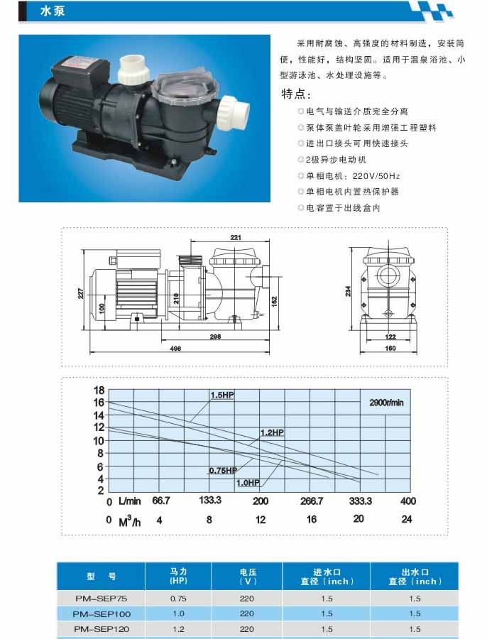 泵體密閉性能好,防腐性能極佳,堅固耐用,耗電量少,散熱快、安裝簡便。適用于溫泉浴池、小型游泳池、水處理設施及裝飾性水池。