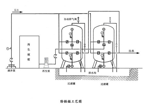 一般地下水中的鐵通常以二價鐵離子形態存在。經過曝氣使二價鐵、錳被氧化成高價鐵、錳離子,形成不溶于水的氫氧化物,再通過過濾去除,達到國家飲用水的標準。