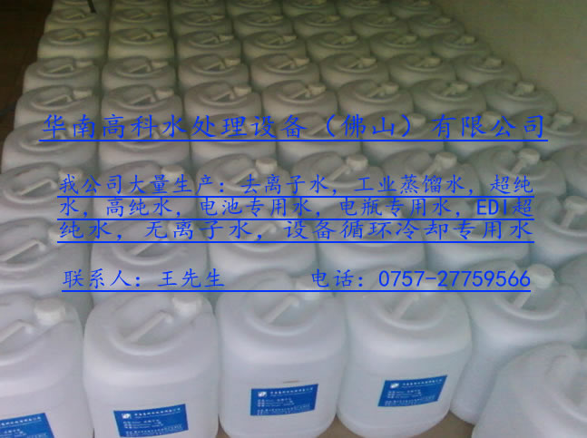 華南高科水處理設備(佛山)有限公司是一家專業從事水處理設備相關產品生產,銷售的企業。大量生產工業蒸餾水;去離子水(優于蒸餾水);工業超純水;DI超純水,無離子水,電池專用水,產品因品質好價格優得到廣大用戶一致好評和認可。 達到水質在線測標準:工業蒸餾水電阻5MΩ*cm;去離子水電阻大于10MΩ*cm;無離子水大于10MΩ*cm, DI超純水大于18MΩ*cm,工業超純水電阻大于15MΩ*cm;電池專用水電阻大于10MΩ*cm。 規格:25升/桶, 電話:0757-27759566