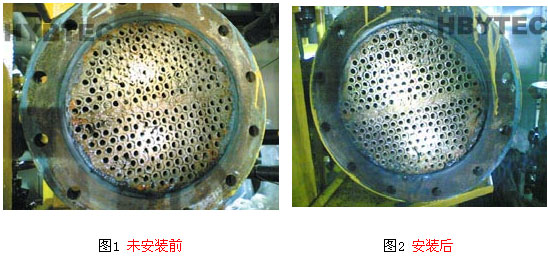冷油器循環水系統是用于冷卻發電機的軸承潤滑油, 該水系統添加了大量次氯酸鈉來殺菌除藻,從而引起水的PH值升高,使得溶液過飽和,導致碳酸鈣結晶在管壁上,吸附在管壁上的還有一些泥和銹,這種垢和泥的混合物嚴重影響了冷卻效果。(圖1)該廠不得不進行定期酸洗來清除管道內的垢混合物,但經常的酸洗嚴重腐蝕了管道。