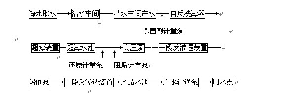 本系統的工藝流程如上圖所示,分為海水取水、海水預處理、反滲透海水淡化幾個部分。