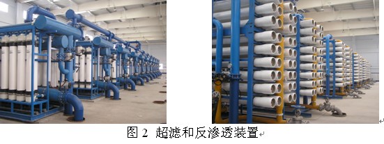 預處理系統由1套殺菌劑投加裝置、4臺1000立方米每小時的自反洗濾器、11套超濾裝置、1個超濾水池、1套超濾反洗系統。投加殺菌劑NaClO抑制細菌、微生物在超濾及超濾產水池繁殖。