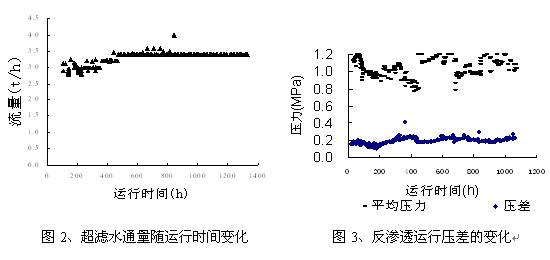 圖2為超濾水通量隨運行時間變化,可以看出:超濾通過每隔30分鐘定期氣水反洗,保持了平穩的流量。在跨膜壓差達到0.2MPa時,仍能保持21L/m2•h,通量基本維持在25-26 L/m2•h。超濾產水濁度低于0.2NTU以下。水回收率達到95%以上,5%的水主要用于反洗及化學清洗等用途。