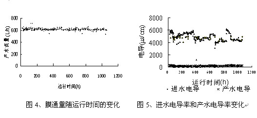 圖4看到在運行期間反滲透膜平均通量達到24.79L/m2•h,最高可達到28.6 L/m2•h,并且流量比較平穩,沒有比較大的衰減。由圖5可以看出,反滲透產水電導率在150μs/cm,達到了用戶自來水的標準;平均脫鹽率達到了97%;反滲透水回收率達到了75%。采用超濾膜和反滲透膜處理放流水試驗,結果表明經過處理的放流水再經膜法處理運行相當穩定,反滲透透過液比工業給水清澈,含鹽量也低,并可以回用于紙機各條生產線中。