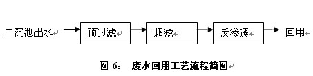 造紙廢水一般含懸浮物較多,碎的纖維狀懸浮物極易堵塞微濾及更細的膜。為避免廢水污物堵塞膜,減少清洗難度和頻率,在工程項目應用中嚴格控制進水的懸浮物量,通常采用常規物化和生化處理的二沉池出水作為膜法處理工藝的進料液,放流水水質:pH為7~8,COD在80--150mg/L左右,SS為20~50mg/L,已達到國家一級排放標準。放流水經預過濾后才能安全進入膜法處理系統。超濾結合反滲透膜造紙廢水回用工藝已成功應用于江蘇某紙業公司20000 m3/d放流水回用系統一期工程中。工藝流程如圖6所示。