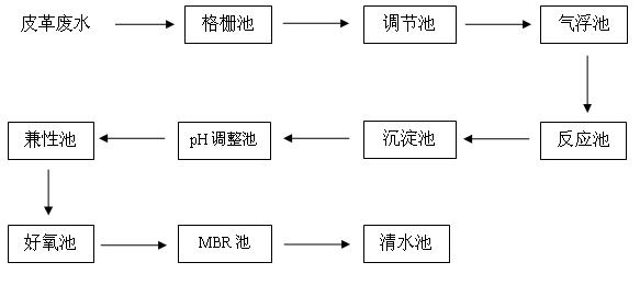 我公司遵循先物化再生化的處理理念,自主研發了一種以“A/O生化處理工藝+MBR膜生物反應器”為核心的組合式制革工業廢水處理工藝,以膜生物反應器(Membrane Bioreactor,MBR)工藝提高了生化處理效果、代替傳統工藝中的二沉池,減少處理系統占地面積。