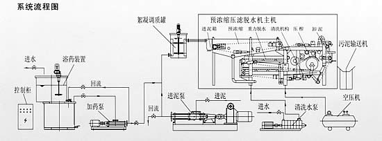 帶式濃縮壓濾機是由帶式濃縮脫水段和帶式壓榨過濾段這兩部分組成的,為了提高污泥的脫水性,改良濾餅的性質,增加物料的滲透性,應對污泥進行化學調理。