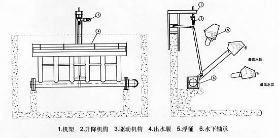 驅動機構采用德國布魯克·漢森的電機和減速機,也可采用原裝進口精密伺服馬達和驅動裝置。升降機構是通過蝸輪傳動絲杠完成提升,下降功能的。機架和中間連桿等水上部件為碳鋼焊接件表面進行熱鍍鋅處理。水下部件及標準件為304不銹鋼,排水支管、排水總管等經酸洗、鈍化處理。
