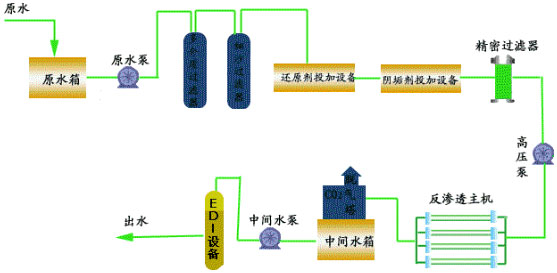 ●預處理-二級反滲透-中間水箱-水泵-EDI裝置-純化水箱-純水泵-紫外線殺菌器-0.2或0.5μm精密過濾器-用水對象