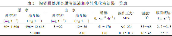 Chen等人經過比較采用孔徑為0.05μm的氧化鋯膜處理金屬清洗液,通過過濾除去廢水中的油和雜質,濾過水補充適當的表面活性劑即可重新使用,其結果見表2。冷軋乳化液是軋鋼行業產生的一種廢水,水中主要含有1%~3%的礦物油、乳化劑,與金屬清洗液比較類似,常規的方法處理效果不好,且處理費用高,目前冷軋乳化液處理是困擾我國軋鋼行業的一大技術難題。張國勝采用0.2μm的氧化鋯膜處理武鋼冷軋乳化液廢水,比較了孔徑、膜材質等對過濾通量的影響,優化了操作過程,其結果見表2。目前,采用氧化鋯微濾膜處理冷軋乳化液廢水已經在我國開始工業化應用,必將推動這一領域的科技進步。
