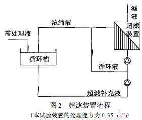 超濾(Ultrafiltration,常簡寫為UF)是一種膜分離技術,它與反滲透很相似,也是利用半透膜以壓力差作為推動力的膜分離過程,通過有選擇性的膜,將溶液中的不同分子量的微粒加以分離,在介質壓力下,小于孔徑的微粒隨溶劑一起透過膜上的微孔,大于孔徑的微粒被截留。膜上微孔的尺寸與形狀決定了膜的分離性能。被截留的微粒子不能形成濾餅,仍以溶質形式保留在濾液中。由膜管和循環泵等元件組成的裝置,稱為超濾裝置。超濾裝置流程見圖2。