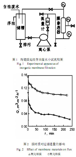 化學法治理的主要缺點是消耗大量的化學藥劑,并難以達到理想的破乳效果,且產生新的含油污泥。膜分離方法主要是通過膜對油滴及懸浮粒子的有效截留,而達到油水分離的目的。具有出水水質好、操作方便、占地面積小、不產生新的污泥等優點。高分子膜在此方面已有了較多的研究和應用。但由于其材料本身的限制,對于膜污染的控制手段、膜清洗的方法等方面均受到一定的限制,主要表現為通量較低以及出水的油含量難以穩定。與有機膜相比,無機陶瓷膜由于其具有較高的通量、優異的機械性能和良好的截留能力及耐酸堿、耐有機溶劑、清洗方便、使用壽命長等突出優點,已日益顯示出其極強的競爭力,成為乳化液廢水治理有發展前景的方法之一。如Bansal等用動態氧化鋯膜對各種類型的乳化液廢水進行了處理,以及Behave and Fleming使用氧化鋁膜在此領域也進行了一些研究工作,得出了一些規律。但由于各應用體系的特殊性,仍需對特定的體系研究主要的操作參數對過濾性能的影響,以確定適當的操作條件。本文采用國內已工業化生產的陶瓷微濾膜處理鋼鐵廠乳化液廢水,以得到合適的膜操作參數和清洗條件,為陶瓷膜在此領域的進一步工業應用提供依據。