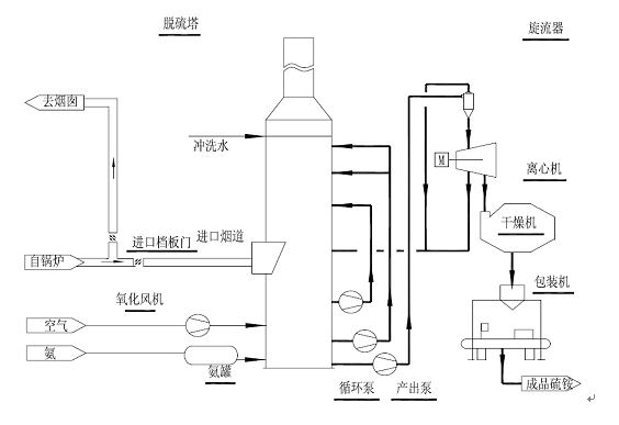 一定固含量約硫酸銨漿液送至硫銨工序經旋流器脫水、離心機固液分離,形成濕硫銨,母液回脫硫系統;濕硫銨經干燥機干燥,得到水分<1%的硫銨,進入包裝機包裝即可得到商品硫銨。其工藝流程圖見圖1: