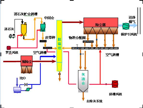 系統主要由消石灰貯存輸送、循環流化床吸收塔、噴水增濕、除塵器、除塵器收灰循環、脫硫渣輸送、以及儀表控制等子系統組成。