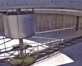 濃縮機由中心傳動裝置驅動傳動軸、刮臂等旋轉,刮臂上的刮板將污泥由池邊逐漸刮至池中心的泥坑中,通過排泥管排出池外;刮臂上固定有攪拌柵條,旋轉時提供絮狀污泥的沉淀空間,加速污泥的下沉,提供濃縮效果。